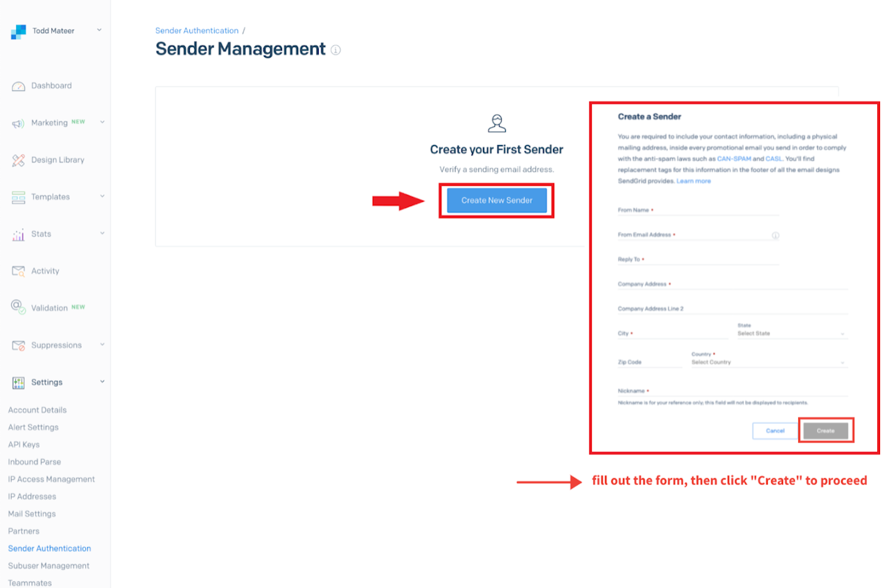 SendGrid Set-Up Create New Sender