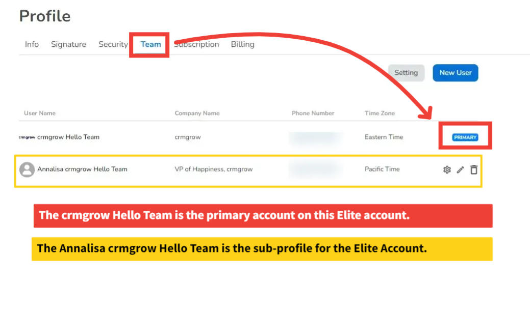 The Team tab allows you to review any sub-accounts that you have added to your primary account. These sub-accounts can be for your personal use or for Team Members who join you as crmgrow users. 🌟