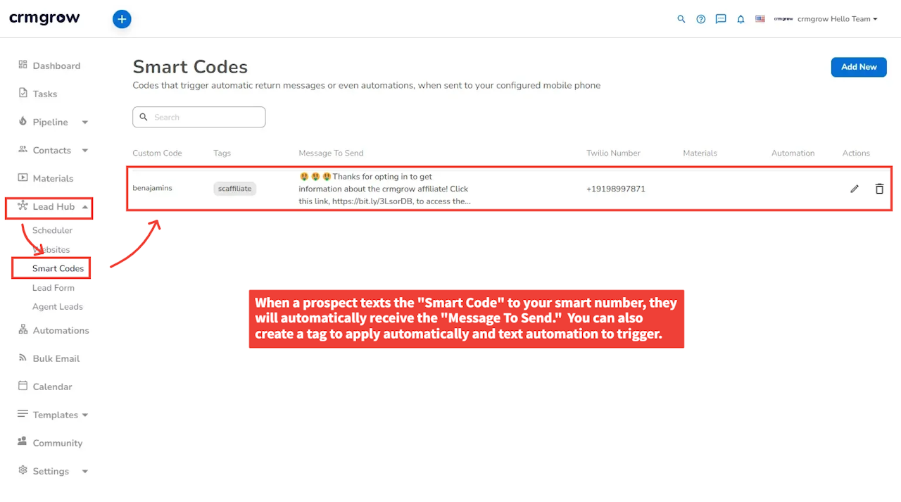 As part of our crmgrow Lead Hub 🌟, which includes a suite of lead generation, advertising, and marketing tools 📈, you can utilize our Smart Codes 📱 alongside the Smart Number you set up for texting and phone calls ☎️ with your contacts within crmgrow.
